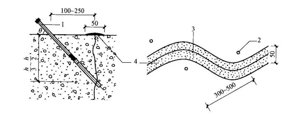 對于普通裂縫,可以采用鉆孔或貼嘴埋設(shè)注漿嘴方法。如圖1、圖2所示,圖中h為鉆孔與裂縫距離或孔距(mm)。采用鉆孔埋設(shè)注漿嘴時,鉆孔可布置在裂縫的一側(cè)或兩側(cè),鉆孔排數(shù)、孔深、孔排距、斜孔傾角等參數(shù),按設(shè)計要求執(zhí)行,埋設(shè)注漿嘴時,應(yīng)在孔內(nèi)填入少量細(xì)石或棉紗。采用貼嘴注漿法時,裂縫交叉點、尖滅點應(yīng)布置貼嘴。注意事項:不論是鉆孔還是貼嘴,注漿管的下部一定要與裂縫相連通;注漿之前,均應(yīng)對裂縫表面進行可靠封閉,能承受最大注漿壓力。